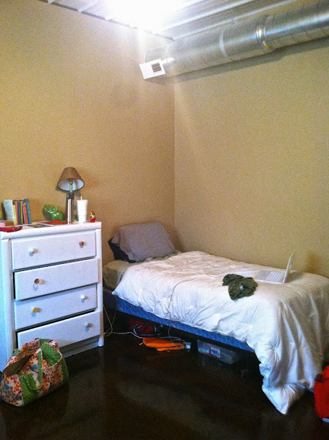 *Sigh* maybe one day it will be pretty in there. Bonus: we have a cute pouf and the curtains aren't too bad. Baby steps.